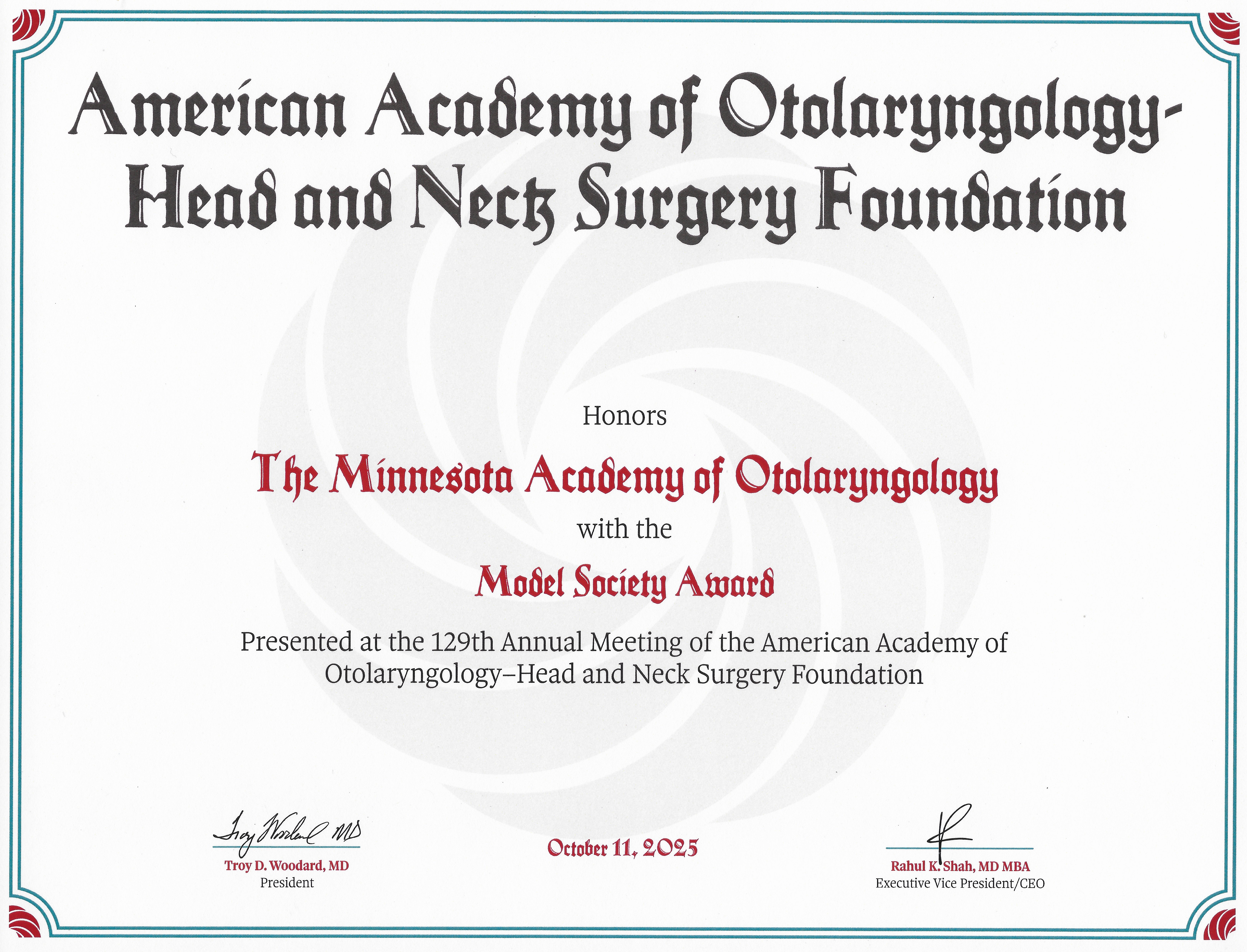 Location: Hyatt Regency Bloomington Dates: January 31, 2026 Let’s come together to honor our past, celebrate the present, and shape the future. You won’t want to miss this milestone event! Check out the website to learn more about the meeting and to REGISTER! CELEBRATING MAO ON THE NATIONAL LEVEL - CONGRATULATIONS!The Minnesota Academy of Otolaryngology was awarded this year's Model Society Award by the AAO-HNS/F and the Board of Governors! Thanks for our amazing members and Board Members who accepted the award on behalf of MAO!